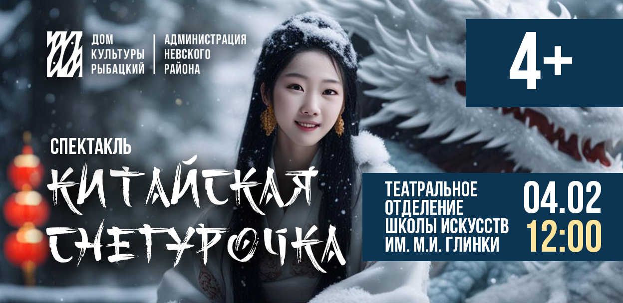 4 февраля в 12:00 в Доме культуры состоится показ спектакля «Сказка о китайской Снегурочке» в исполнении театрального класса Детской школы Искусств имени М.И. Глинки. Спектакль приурочен к празднованию Китайского Нового года
